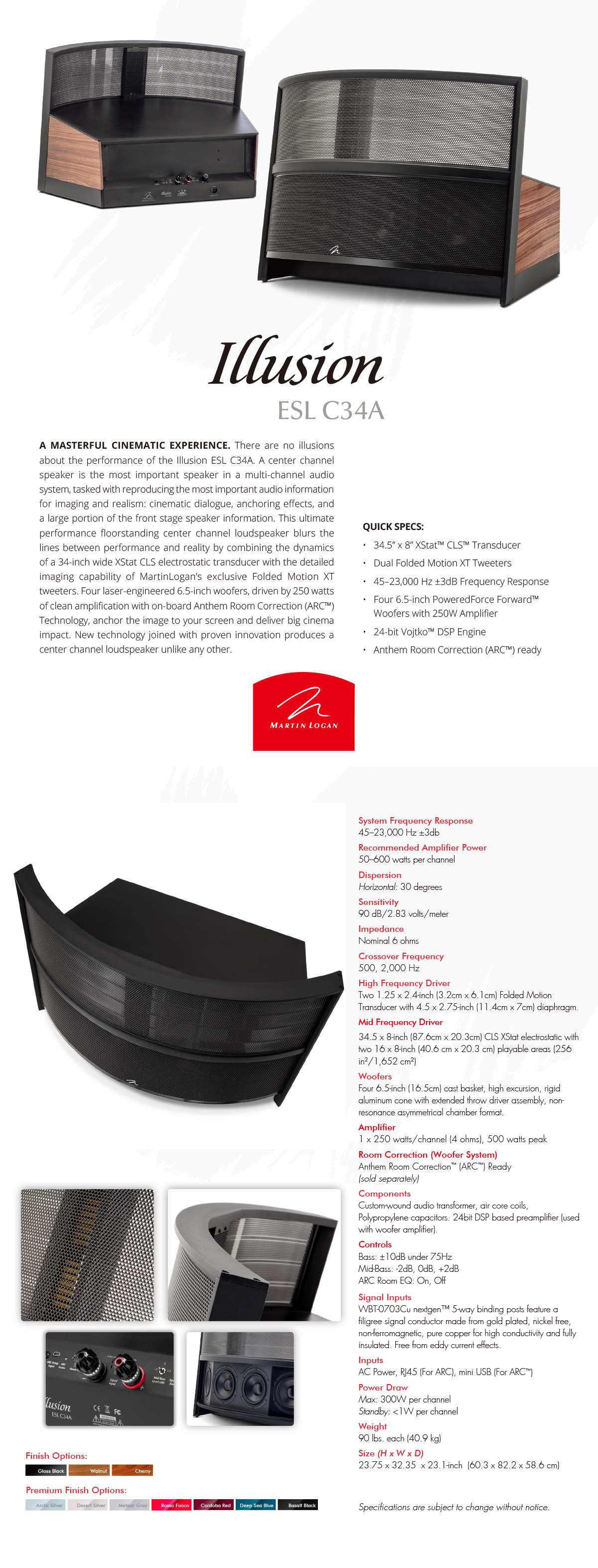 Illusion ESL C34A 是終極性能落地式中置聲道揚聲器,通過將 34 英寸寬 XStat CLS 靜電換能器的動態特性與 Folded Motion XT 高音揚聲器、四個 6.5 英寸 PoweredForce Forward 揚聲器的詳細成像能力相結合,模糊了性能與現實之間的界限™ 低音揚聲器由 250 瓦 D 類放大器供電,並由 24 位 Vojtko™ DSP 引擎和 ARC™(Anthem Room Correction)控制。